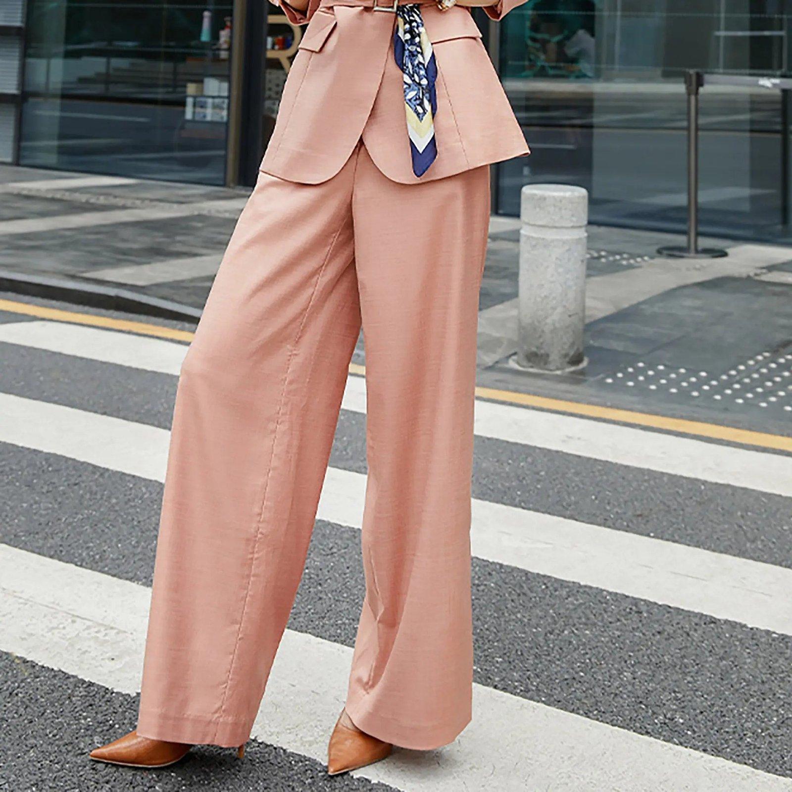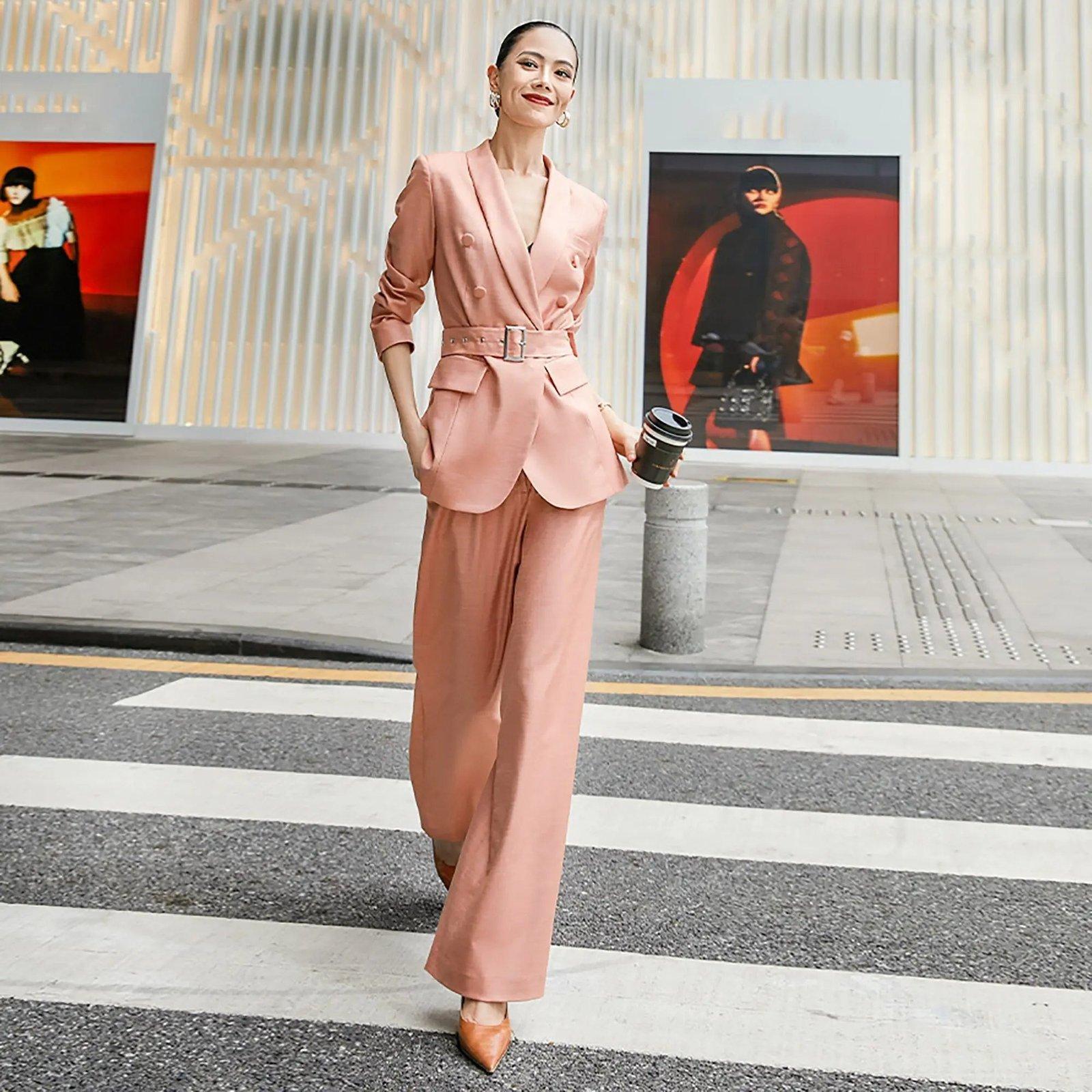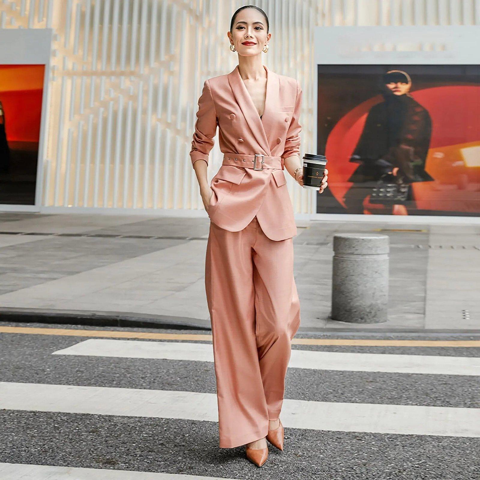Confidence is on this display in this pink pantsuit , a sophisticated addition to any closet.