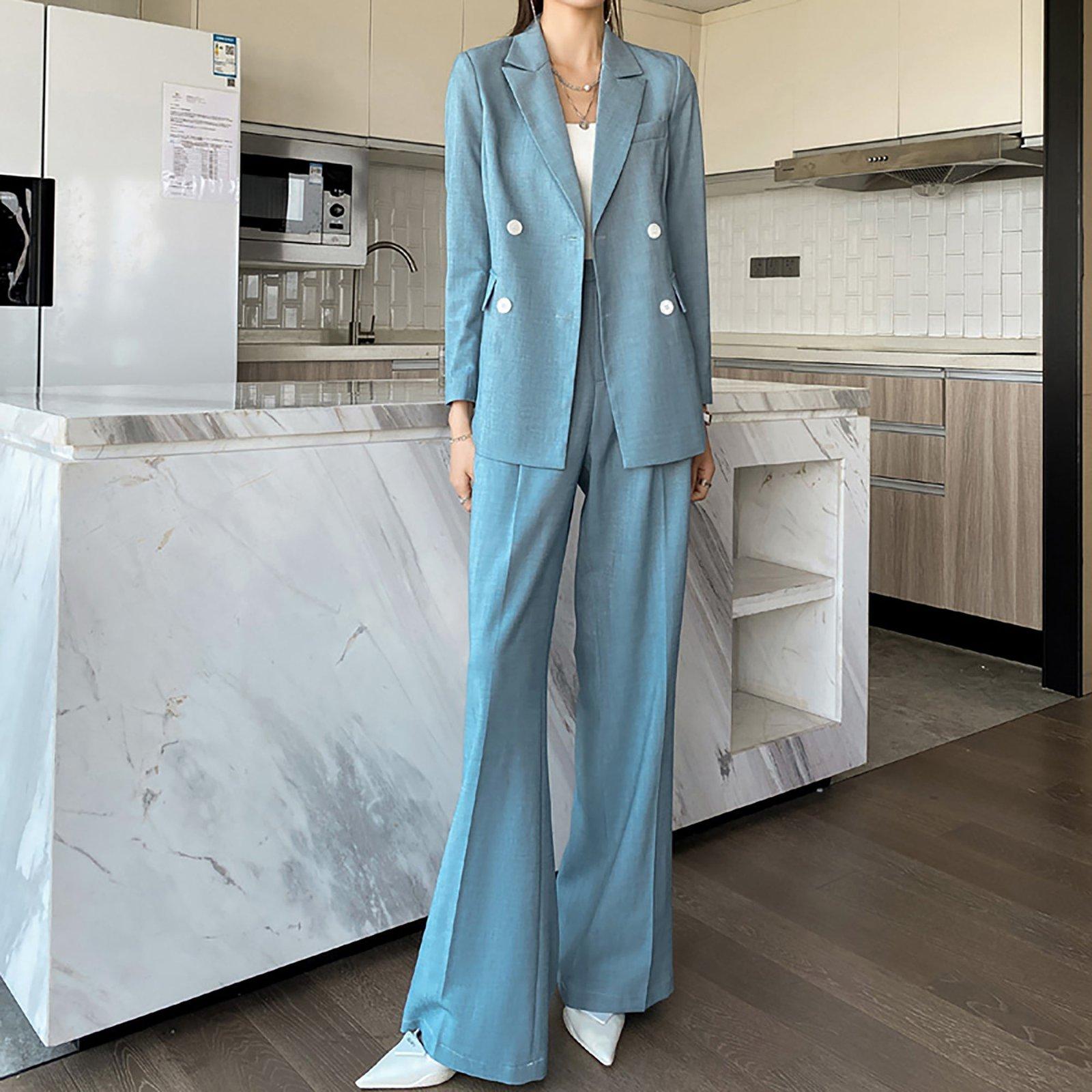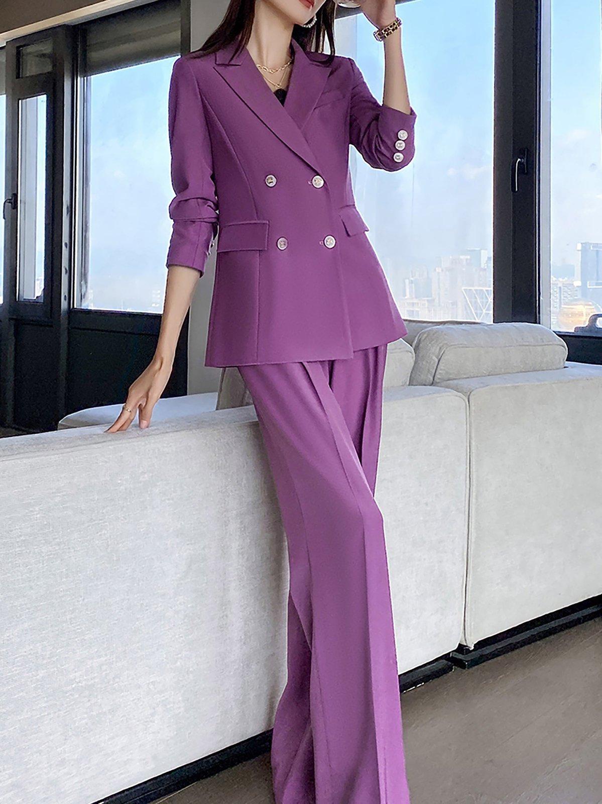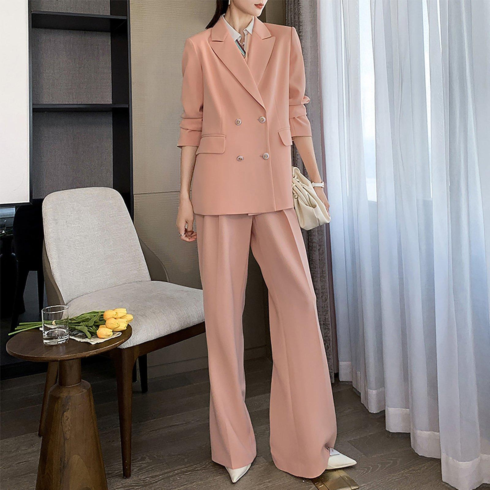 Get dressed with ease and focus on your day with this double-breasted blazer and wide-leg pant suit.