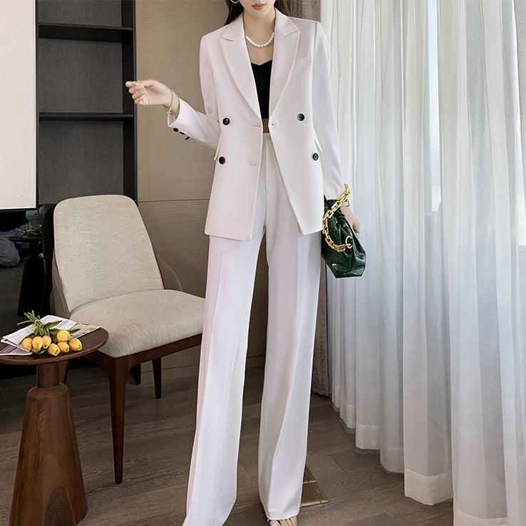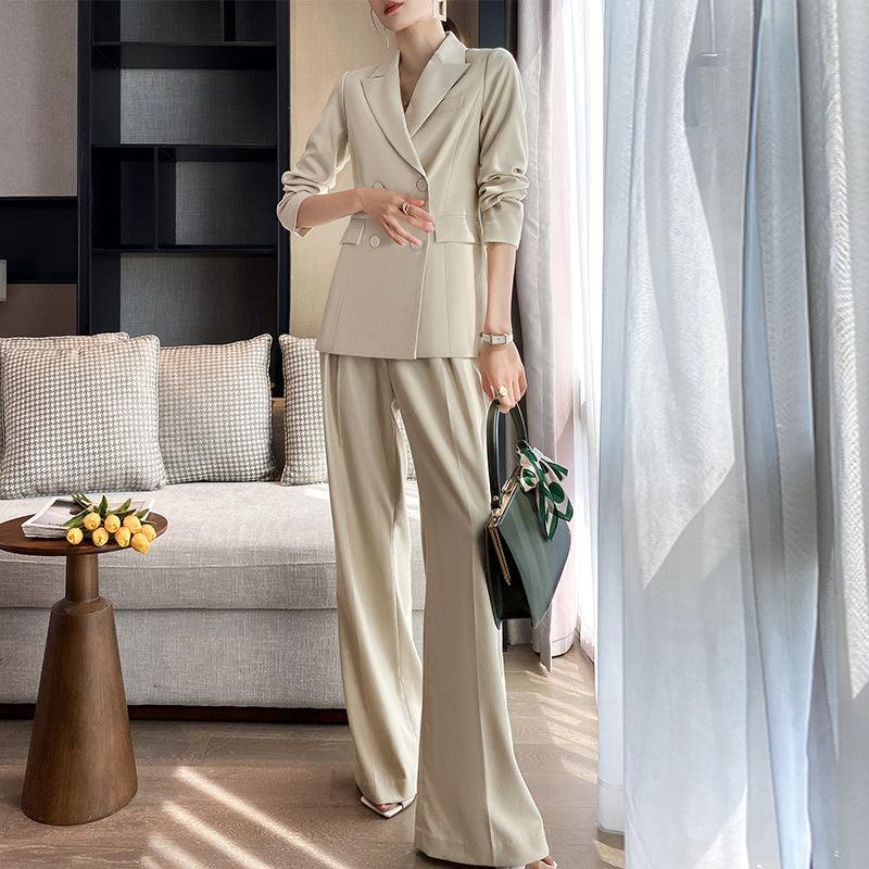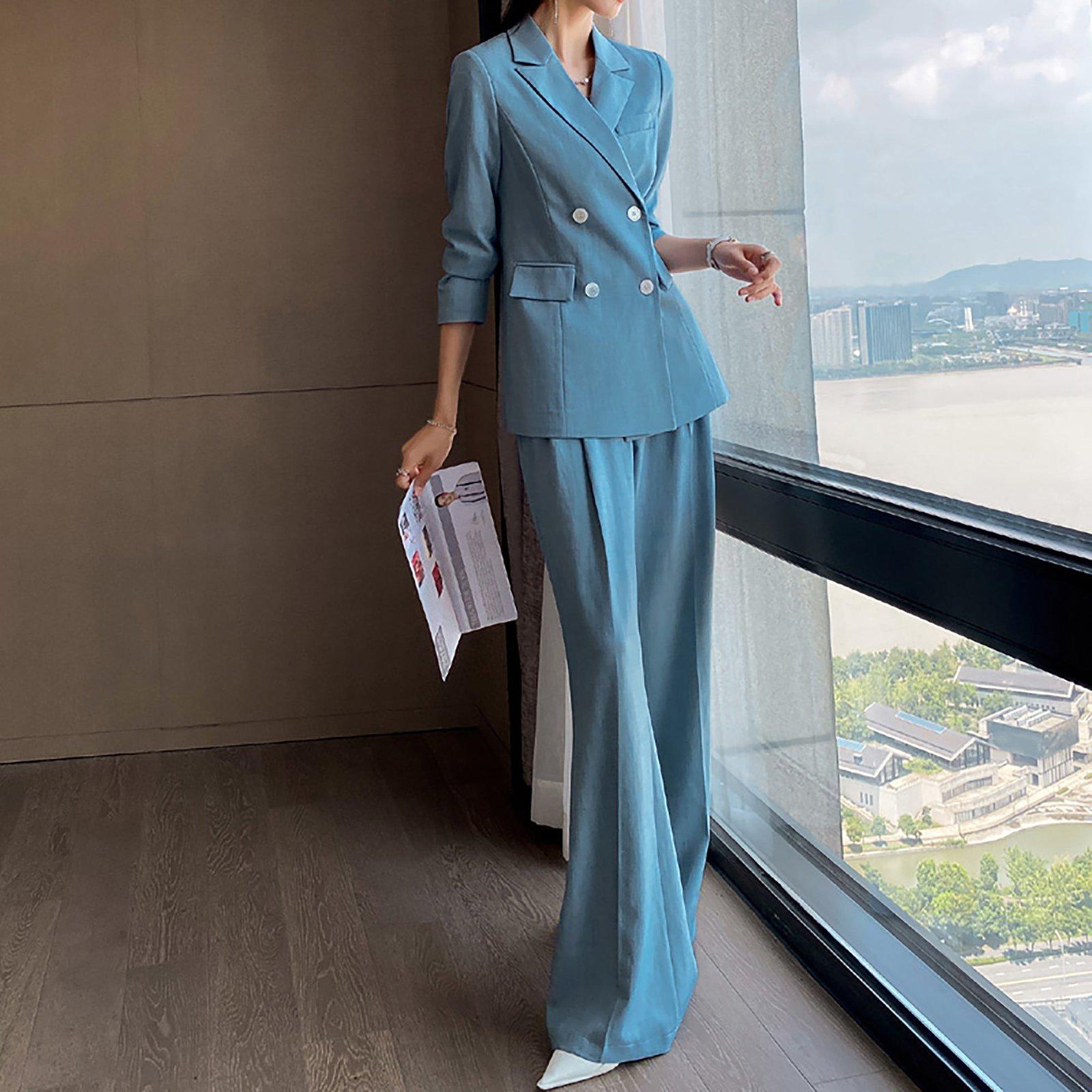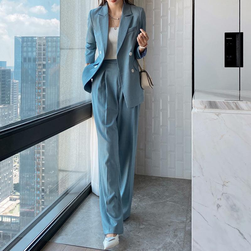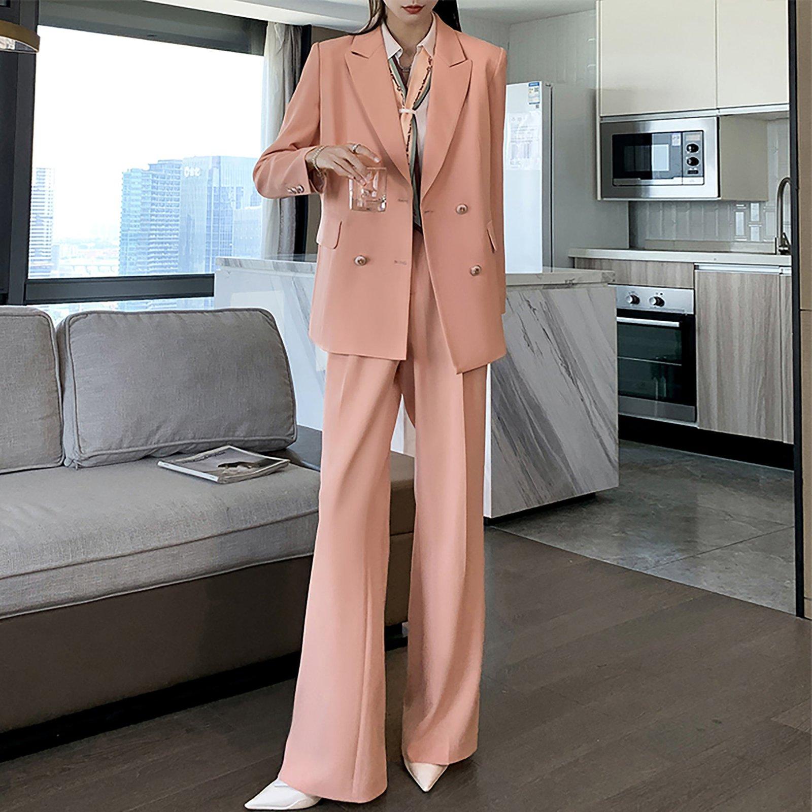 Get dressed with ease and focus on your day with this double-breasted blazer and wide-leg pant suit.