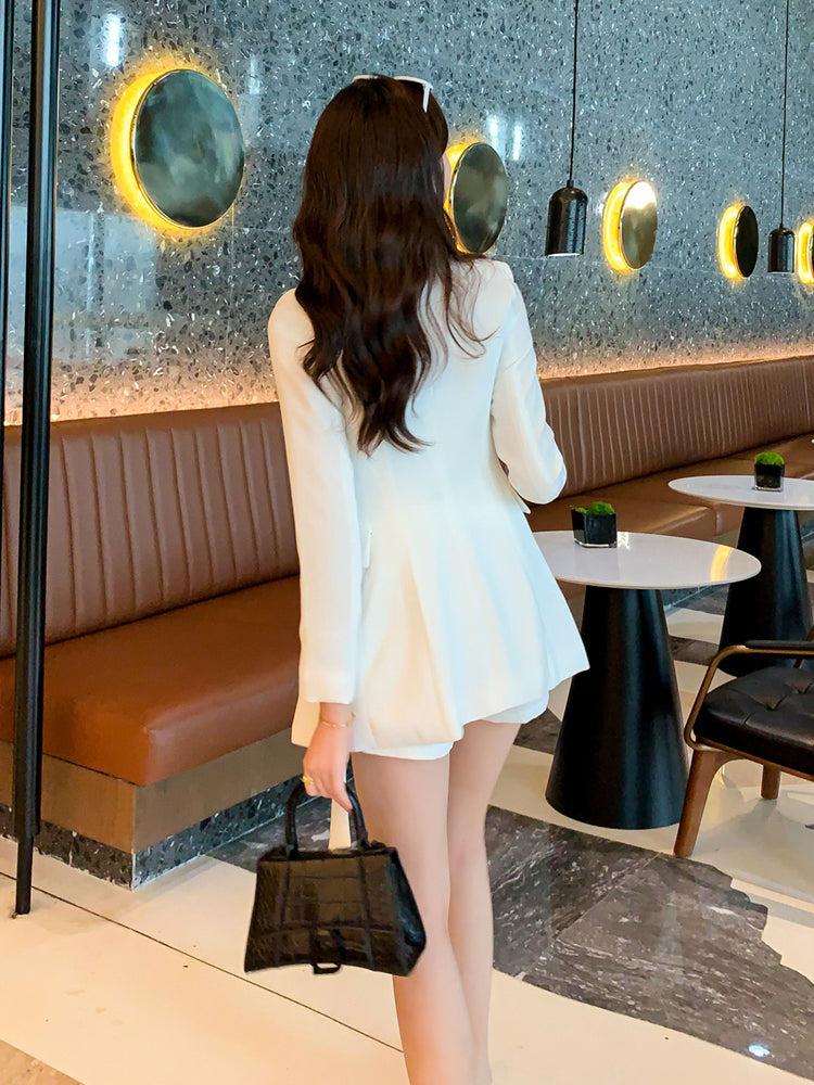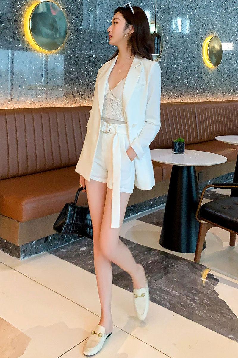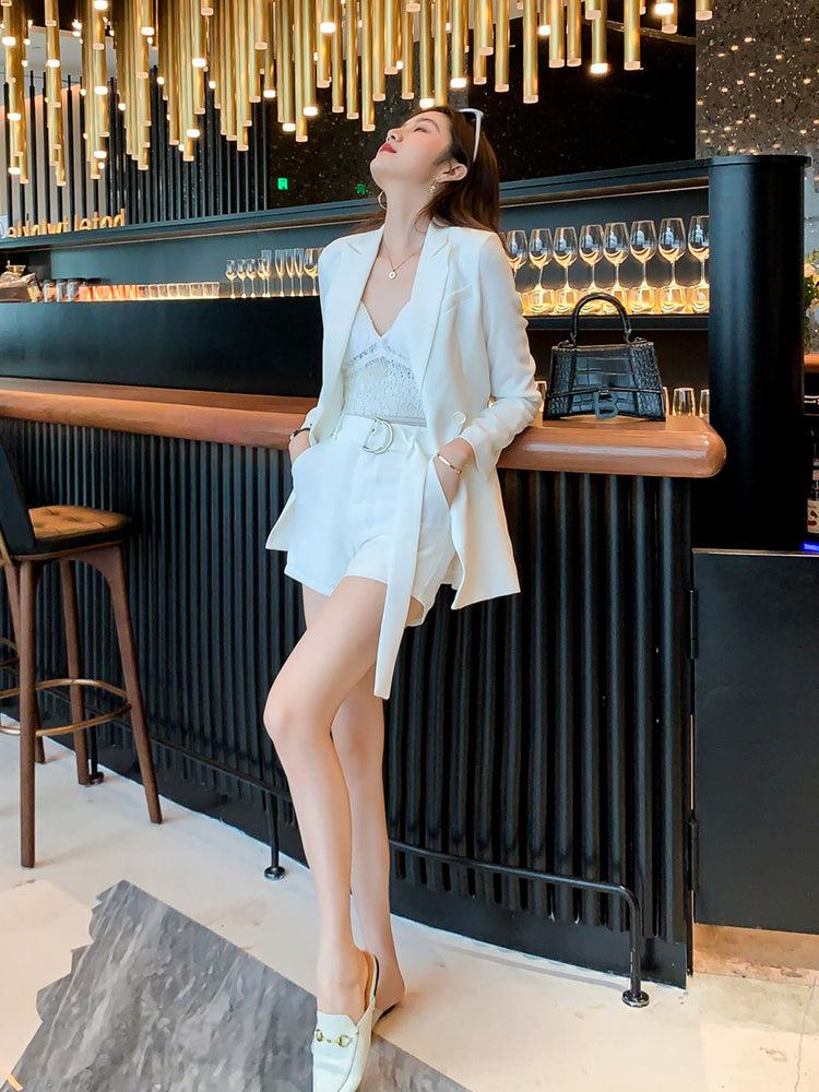 The eye-catching charm of this cute set, which features a sleek jacket and mini shorts, is enhanced by a metal buckle belt.