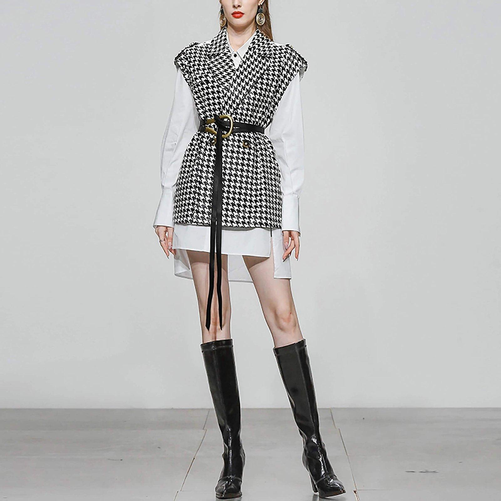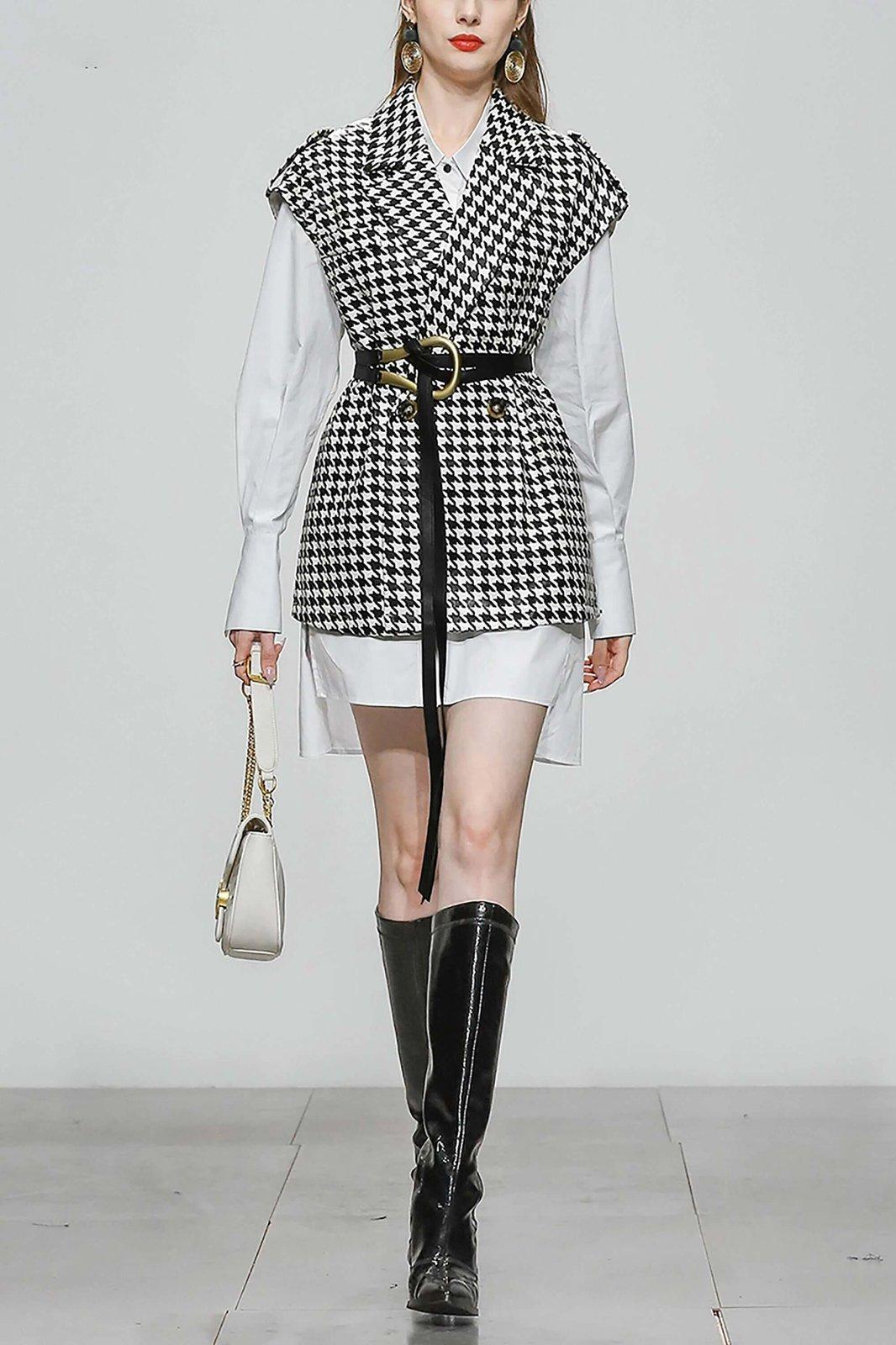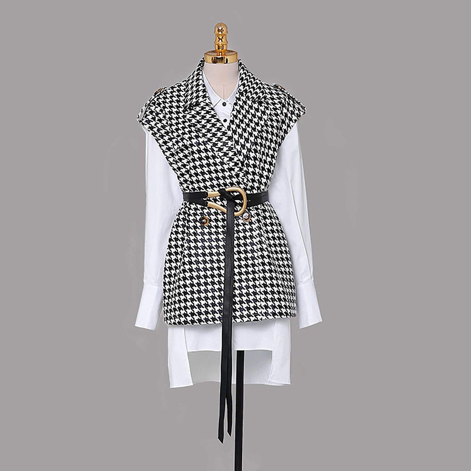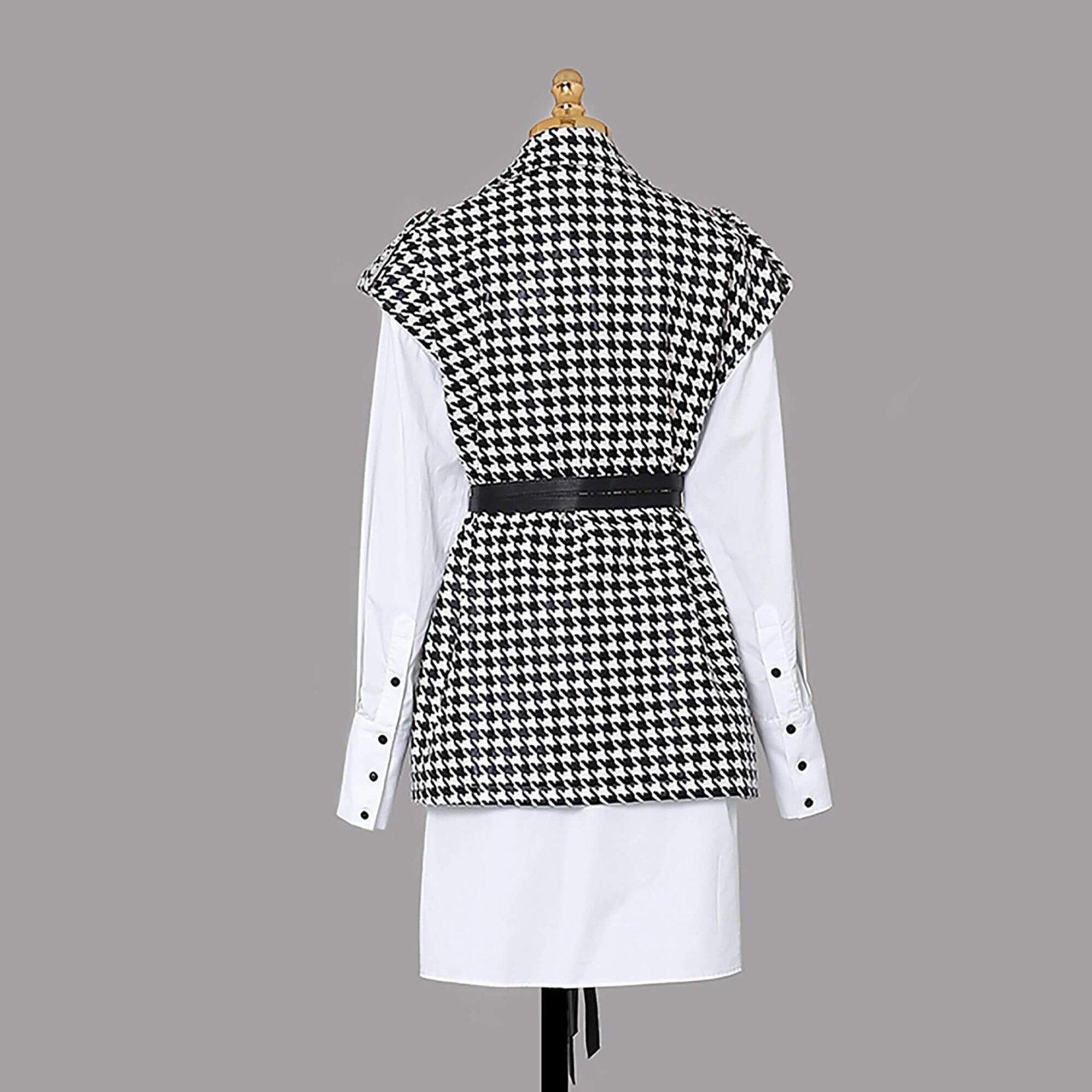 Houndstooth Vest & Long White Blouse Two-Piece Set