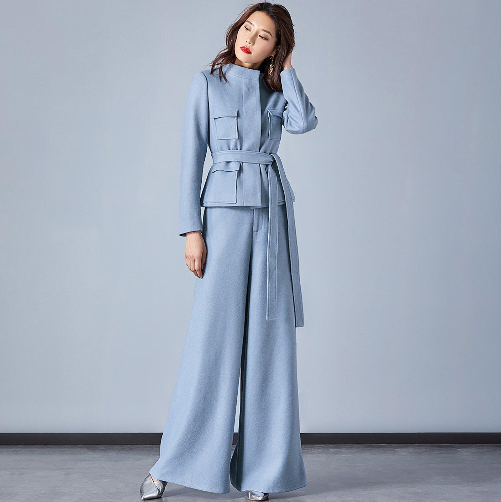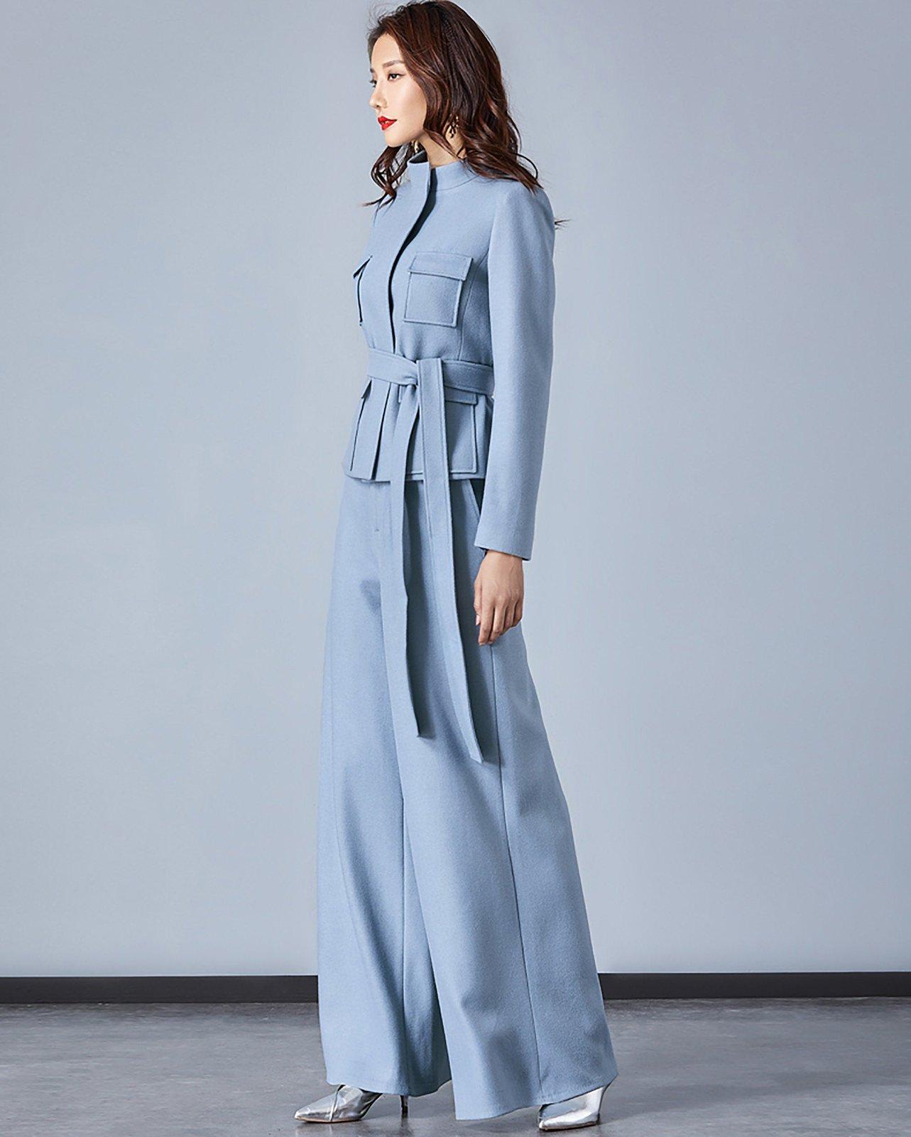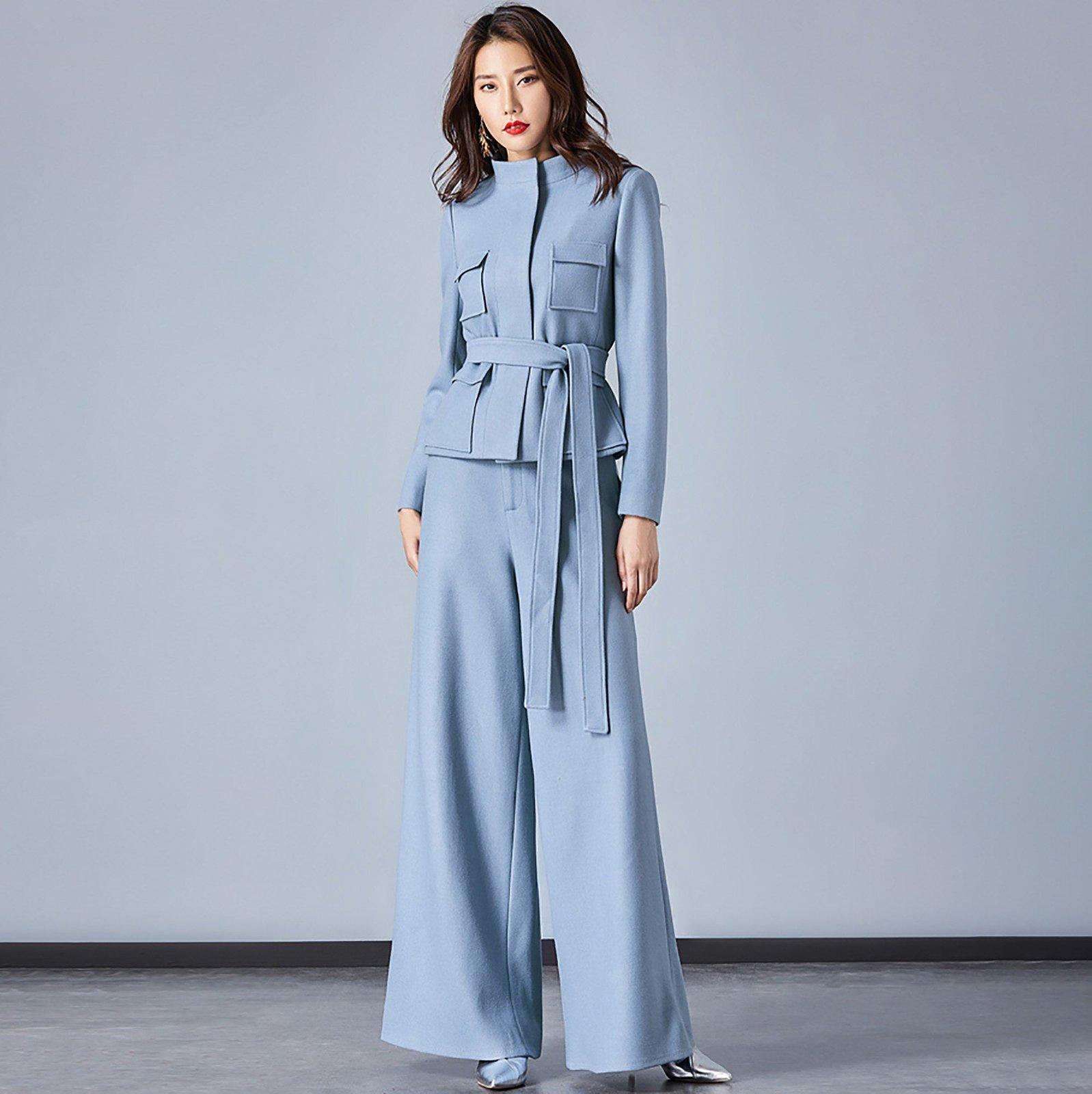 • Light Blue Stand Collar Belted Blazer & Wide Leg Pants Set
