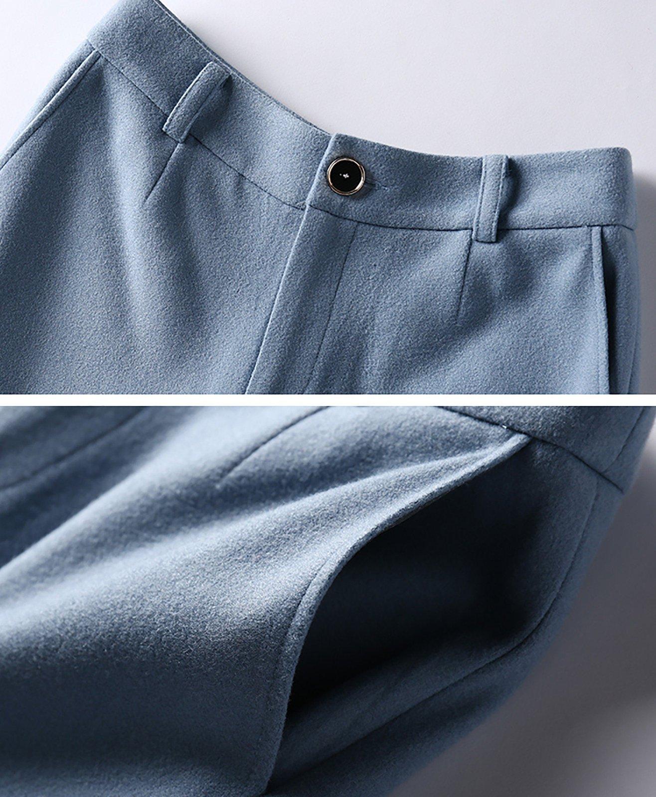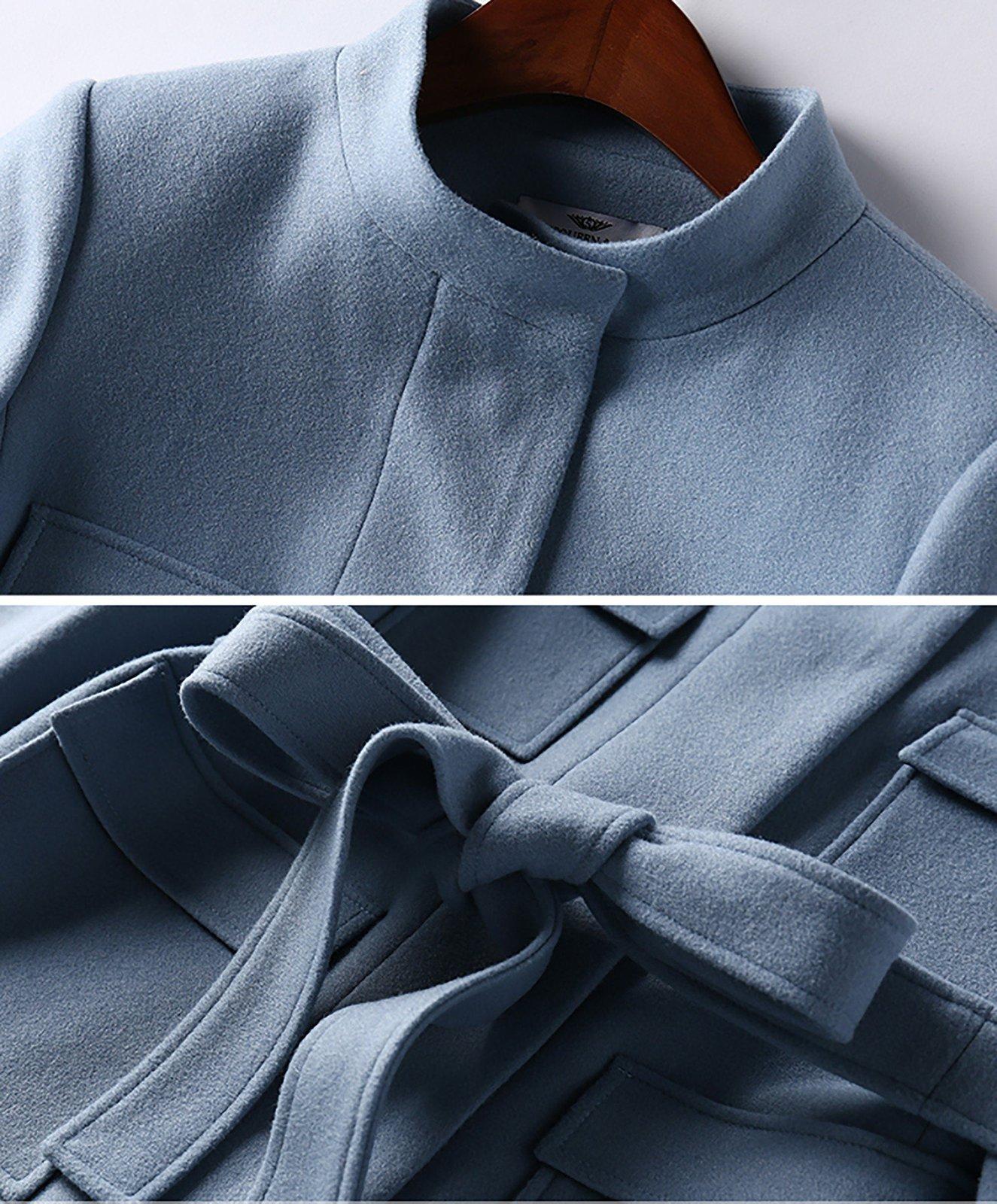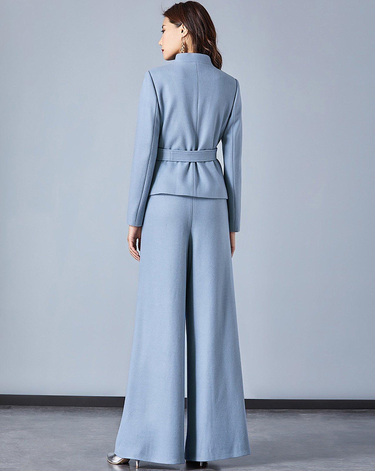 • Light Blue Stand Collar Belted Blazer & Wide Leg Pants Set