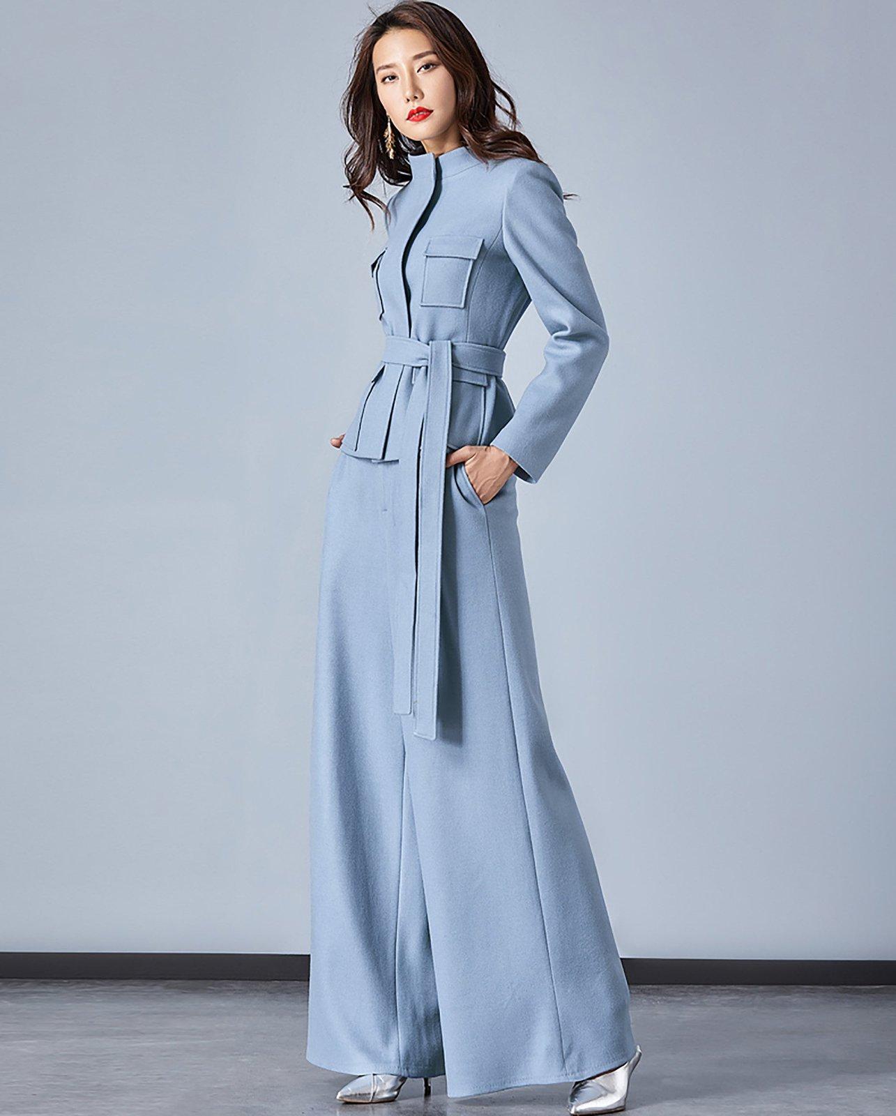 Light Blue Stand Collar Belted Blazer & Wide Leg Pants Set