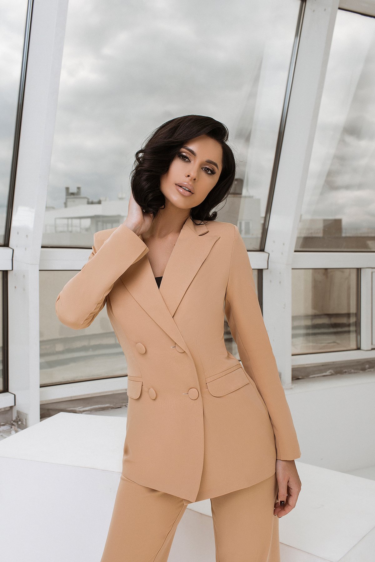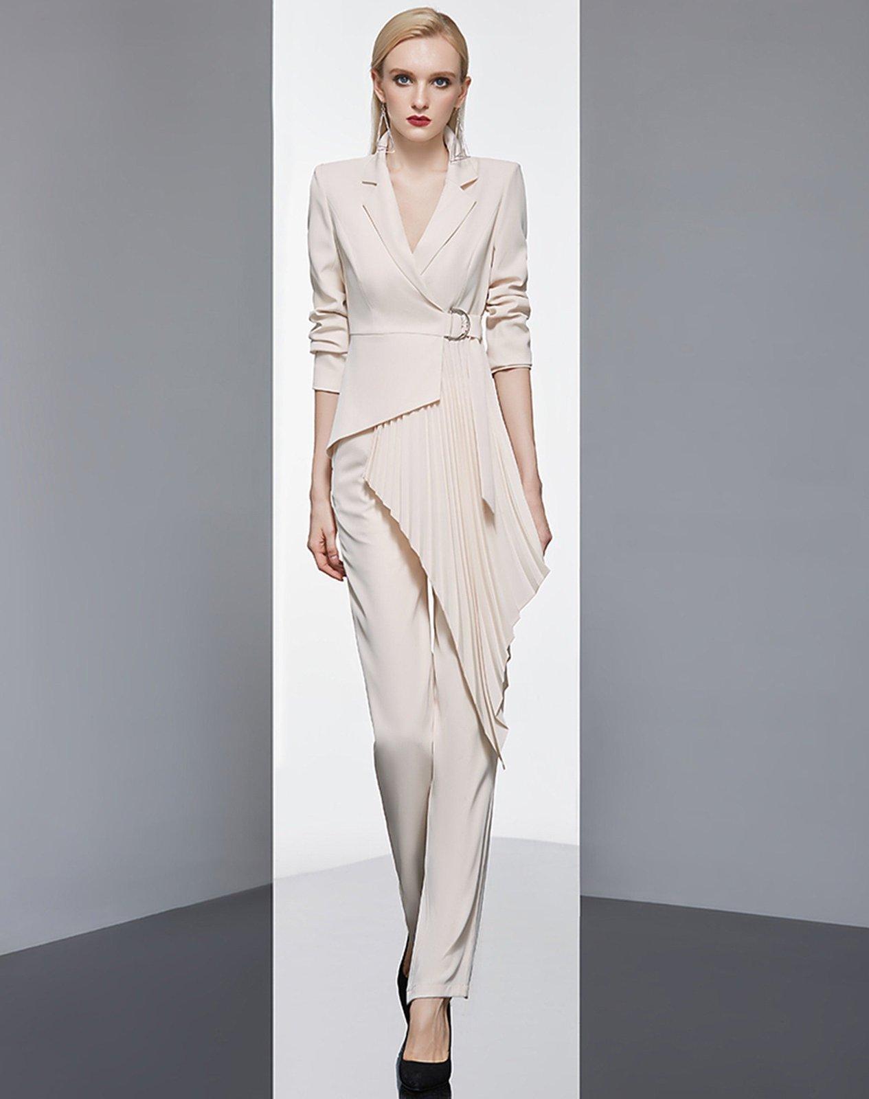 Women Beige Pleated Blazer Pants Set Suit, 2-piece Jacket Trousers Set, Wedding Guest Suit,Casual Shirt Pants Suit Set, Womens Top Pants Set
