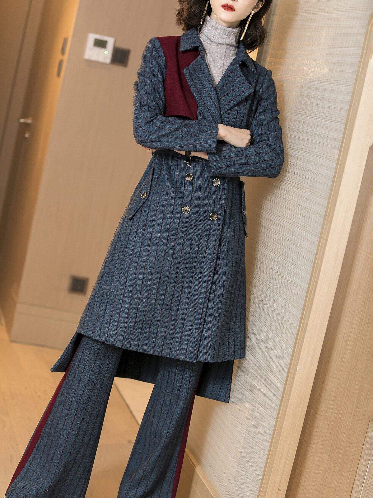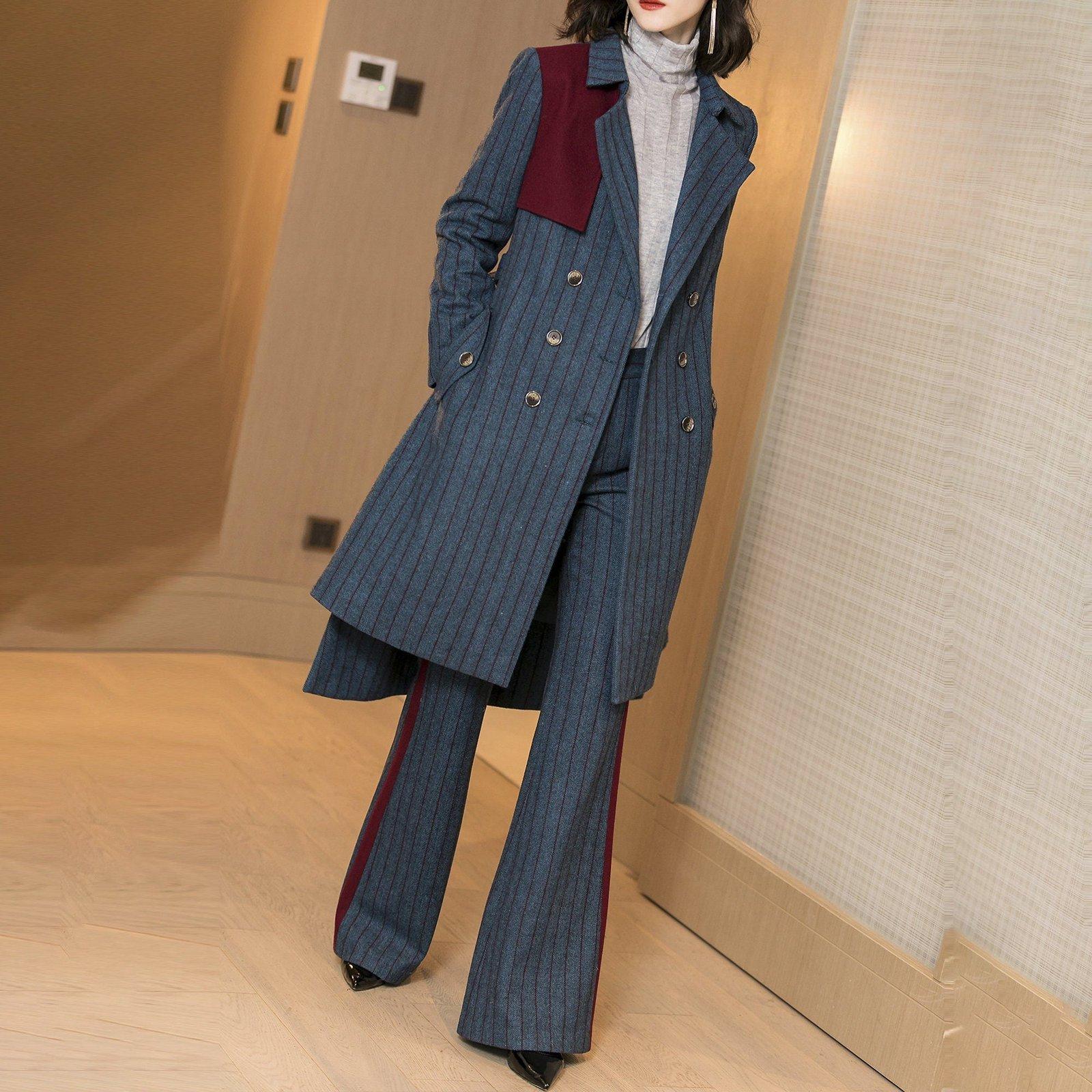 Two Tone Wool Blend Double Breasted Blazer & Flare Pants Set