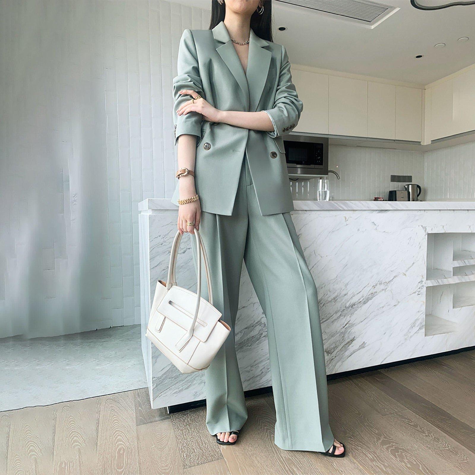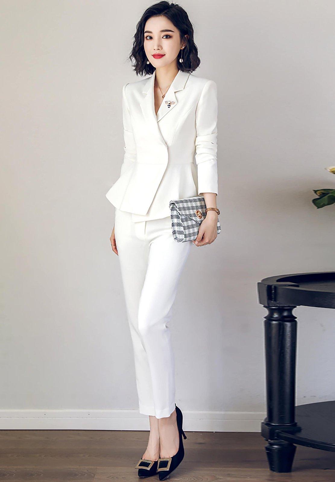 Women Contrast Suit Trousers Set,2 piece sets,long sleeve Blazer Pants Set,White Blazer+high waist pants,Office Lady suit,Wedding Guest Suit