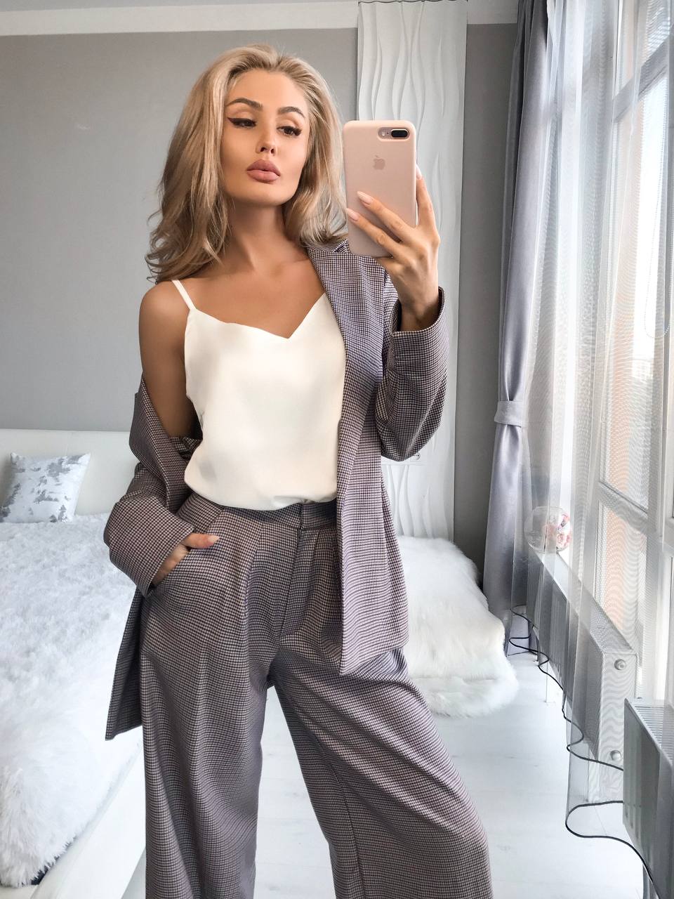 Pink Plaid Belted Blazer & Skinny Pants Set